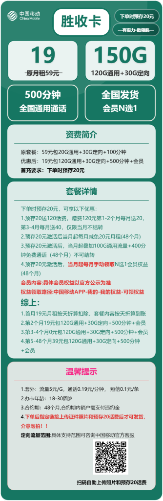 未经允许不得转载:安徽流量卡 » 移动胜收卡19元套餐信息汇总:120G通用+30G定向+500分钟,会员N选1怎么领取与注意事项