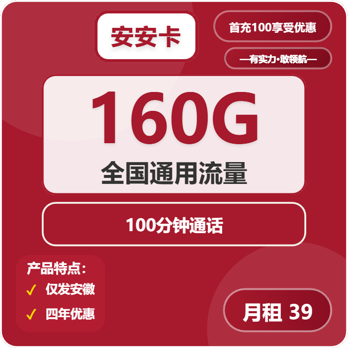 套餐内容:联通安安卡39元包160G通用+100分钟通话