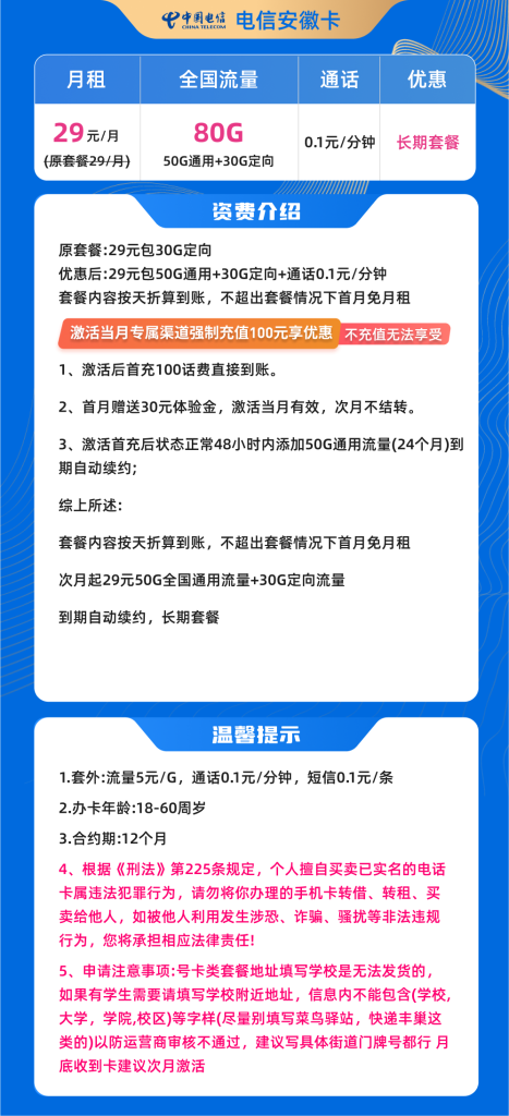 电信安徽卡定位为“省内发货、号码归属安徽”的长期类套餐,月租固定29元,主打以通用流量为主的日常上网需求。